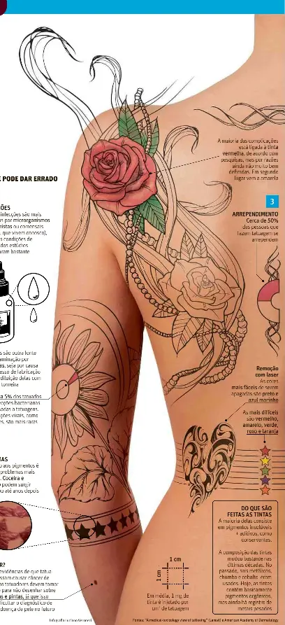 Cobalto na tinta da tatuagem. Coceira vermelhidão mancha bolhas ou descoloração da pele no local da tatuagem. A tinta de tatuagem é perigosa. Tatuagem de henna também tem riscos. Pigmentos azo mercúrio cádmio e ferro na tinta vermelha. A tinta é injetada por. As tintas usadas nas tatuagens na verdade consistem em verdadeiros inimigos para. Os pigmentos que dão a cor às tatuagens são derivados de minerais muitas vezes metais pesados que são prejudiciais à saúde. Os especialistas na arte de tatuar alegam que a principal causa de reações alérgicas é a tinta dado que essa possui substâncias tóxicas como o sulfeto de mercúrio o manganês e o alumínio além de substâncias químicas como o óxido de ferro e alguns hidratos metálicos. Cobalto e cobre na tinta azul. Fazer uma tatuagem de henna também é uma escolha que pode colocar a saúde em risco porque assim como na tinta preta da tatuagem definitiva no caso da henna negra também podem surgir sinais e sintomas de alergia como por exemplo. Tatuagens e saúde. Muitas tintas de tatuagem contêm pigmentos orgânicos usados para dar cor mas também incluem contaminantes e conservantes como níquel manganês ou cobalto.